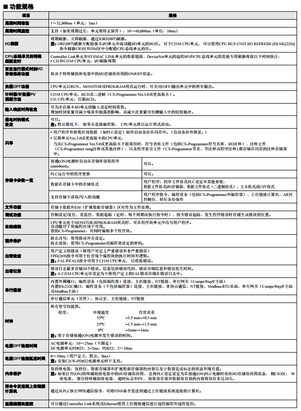 有兩種類型的CPU: 標準型CJ1和超高速型CJ1-H。對于基本指令,最快速度可達20ns(0.02us)。