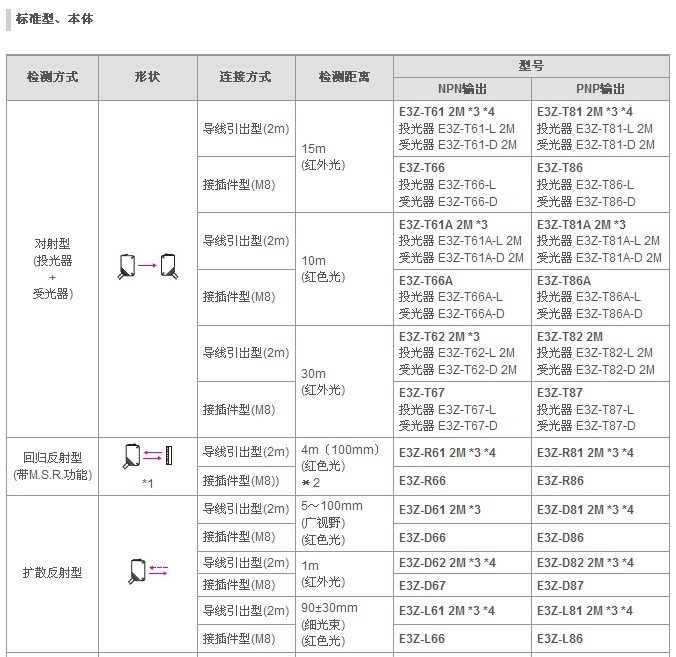歐姆龍光電傳感器(光電開關(guān))E3Z系列產(chǎn)品參數(shù):