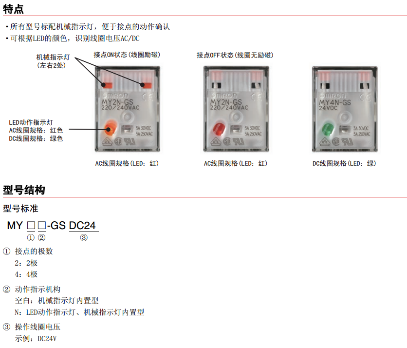 根據LED動作指示燈的顏色,可識別AC線圈規格、DC線圈規格