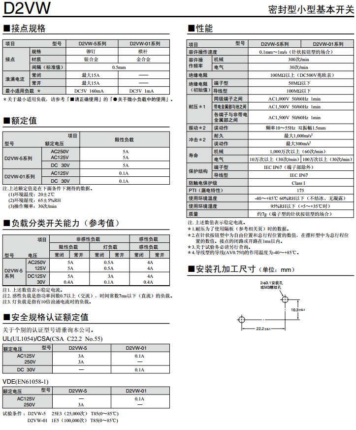 歐姆龍微動開關D2VW系列產品參數: