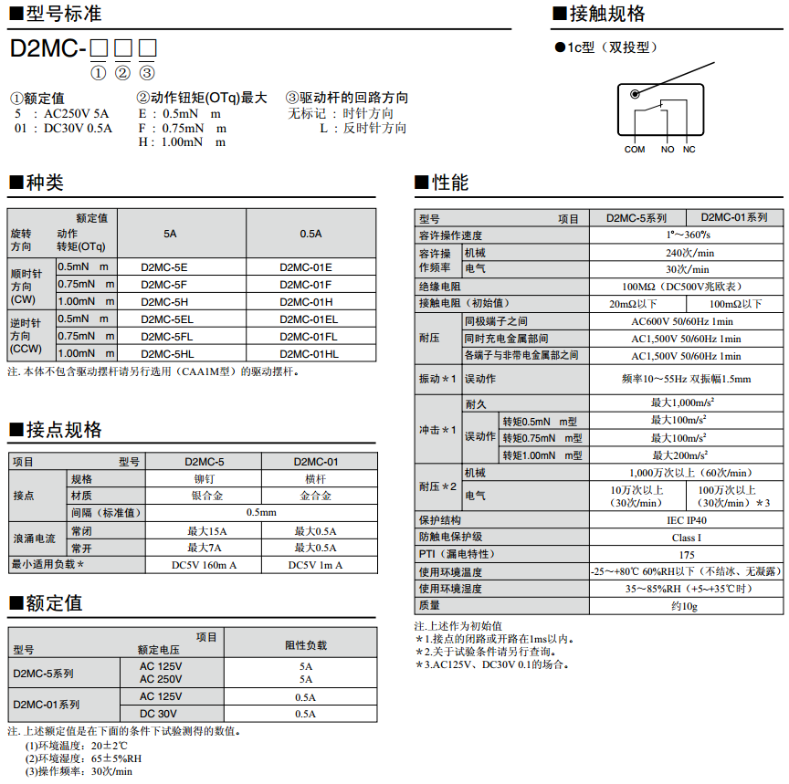 歐姆龍微動(dòng)開關(guān)D2MC系列產(chǎn)品參數(shù):