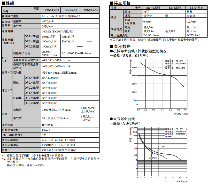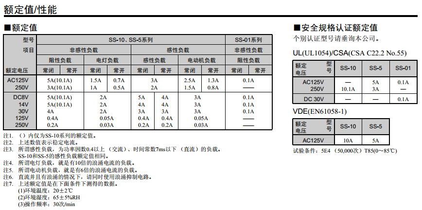 歐姆龍微動開關(guān)SS系列產(chǎn)品額定值/性能: